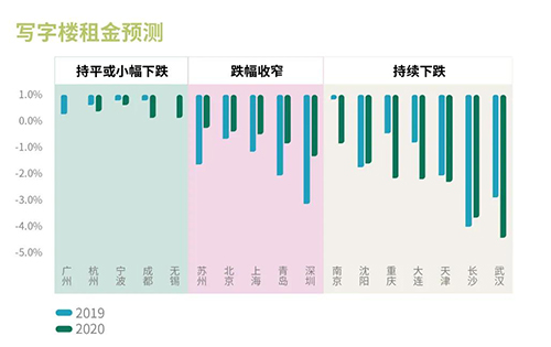 租金仍處下行通道,但跌幅收窄:若疫情整體能在2-3個月內得到控制,其對大多數市場寫字樓租金的影響將是有限的。盡管北京、上海和深圳將繼續保持充足的供應,但基于中美貿易爭端的緩解、金融和科技行業需求的復蘇以及專業服務業的成熟發展,租金下跌的勢頭已經略有緩解。二線城市供過于求的局面在2020年改善的可能性較低,預計租金將同比下降1.8%以上。