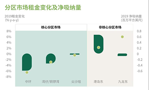 疲弱的租賃需求促致市場上的可租用空間上升。核心分區市場的空置率全都攀升,其中中環的空置率從2018年底的1.3%升至2019年底的3.4%,是自2014年以來最高的年末值。因此,該分區市場的租金同比下降了5.9%,是自2012年以來的年度最大跌幅。