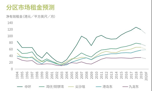 空置率的上升和市場氣氛的疲弱將促使2020年甲級寫字樓的租金進一步軟化。其中,由于空置率正在攀升,而租戶又避免支付過高租金,中央商務區的壓力最大。港島東將繼續受益于低空置率,以及來自中環和灣仔及銅鑼灣的搬遷需求。東九龍也是遷離核心區的理想地點,但該分區市場的空置率較高,致使在短期內租金難以上升。