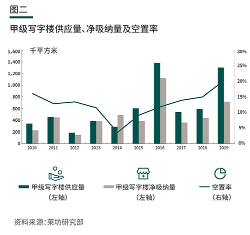 第四季度,由于業(yè)主普遍推行以價(jià)換量的策略以獲取租客,加之年底企業(yè)對寫字樓租賃需求更加旺盛,甲級寫字樓市場整體空置率環(huán)比下降1個(gè)百分點(diǎn)至20.3%。