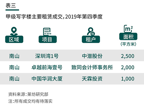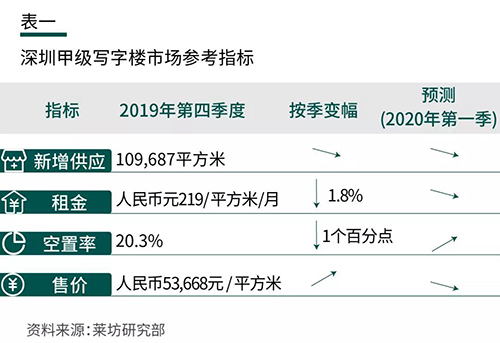 近日,萊坊發(fā)布最新一期深圳寫字樓市場報(bào)告。報(bào)告顯示,第四季度,深圳甲級寫字樓市場新增辦公面積109687平方米,市場凈吸納量為160000平方米。2019年全年,深圳市場共新增甲級寫字樓面積約1303000平方米。