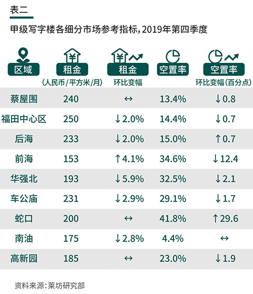 萊坊中國戰(zhàn)略咨詢部高級董事陳鐵東表示,第四季度,深圳甲級寫字樓市場平均租金環(huán)比下跌1.8%至每月每平方米219元。核心商務(wù)區(qū)市場平均租金環(huán)比下跌1.7%至每月每平方米234元。業(yè)主方主動降低租金以吸引租客的做法,帶動第四季度甲級寫字樓市場的整體空置率下調(diào)至20.3%,較三季度環(huán)比下降1個(gè)百分點(diǎn)。