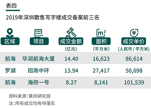 一手散售市場上,深圳銷售型寫字樓的平均成交價(jià)格為每平方米人民幣53,668元。2019年全年,散售成交活躍的寫字樓多分布在前海和羅湖,代表項(xiàng)目包括華潤前海大廈、招商中環(huán)和海府一號等。