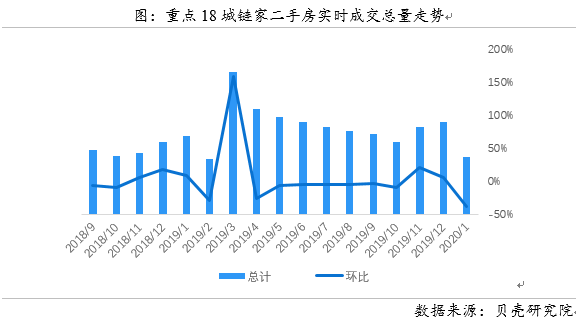 2020年1月重點18城鏈家二手房成交量出現大幅減少,比去年12月份環比下降38%,比去年同期下降27.3%。