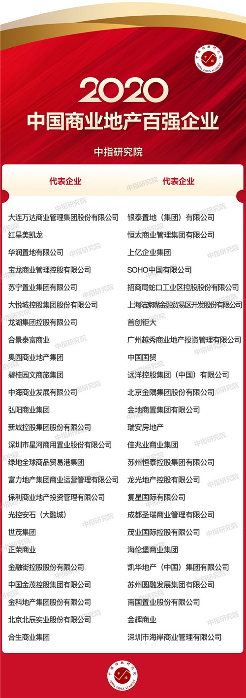 2020年,中指研究院結(jié)合在商業(yè)地產(chǎn)領(lǐng)域多年的研究積累與數(shù)據(jù)基礎(chǔ),啟動(dòng)“2020中國(guó)商業(yè)地產(chǎn)百?gòu)?qiáng)企業(yè)”研究,旨在發(fā)掘行業(yè)中綜合實(shí)力強(qiáng)、運(yùn)營(yíng)水平高、成長(zhǎng)潛力大的優(yōu)秀企業(yè)群體,鼓勵(lì)企業(yè)理性認(rèn)識(shí)商業(yè)地產(chǎn)市場(chǎng)發(fā)展現(xiàn)狀及規(guī)律,緊密跟蹤市場(chǎng)變動(dòng)趨勢(shì),在變革中積極創(chuàng)新謀發(fā)展,引領(lǐng)行業(yè)在新環(huán)境下實(shí)現(xiàn)持續(xù)、穩(wěn)健發(fā)展。