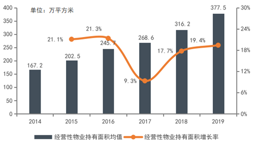 圖 商業(yè)地產(chǎn)百?gòu)?qiáng)代表企業(yè)經(jīng)營(yíng)性物業(yè)持有面積均值及增長(zhǎng)率