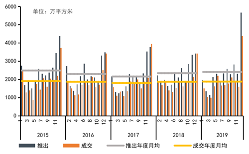 圖 2015-2019年300城商辦用地推出及成交規(guī)劃建筑面積