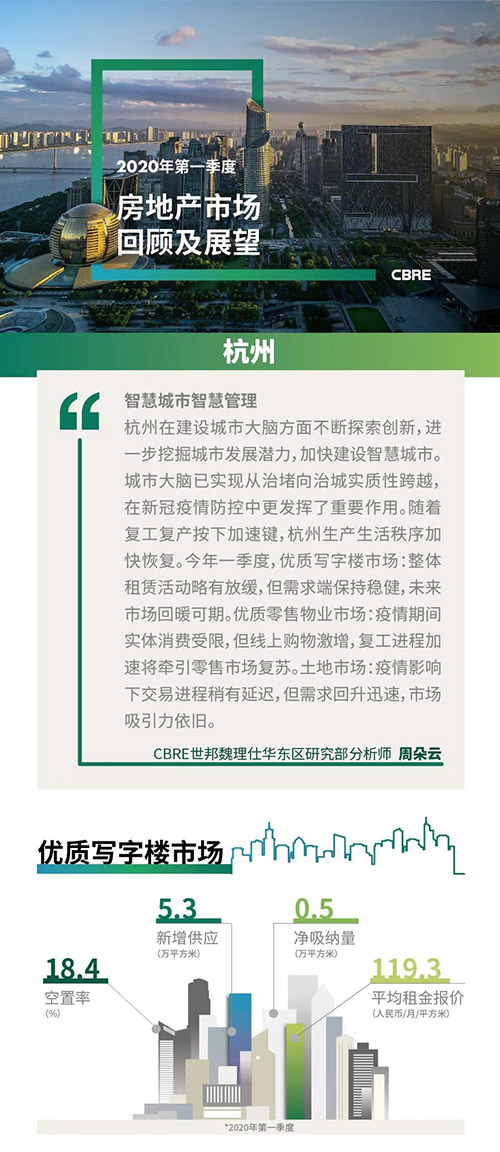 “2020年一季度的新冠疫情與超長春節(jié)假期無疑對整體商業(yè)地產(chǎn)市場帶來一定程度的沖擊,但多以短期影響為主。受惠于杭州優(yōu)異的疫情防控與及時(shí)的政策引導(dǎo),僅在一季度末就能觀察到諸多市場活力復(fù)蘇的跡象。傳統(tǒng)金融行業(yè)自去年下半年開始不斷提升熱度,在新出臺的多項(xiàng)利好措施的加持下,主導(dǎo)一季度全市寫字樓租賃需求。杭城代表性的TMT行業(yè)更是持續(xù)補(bǔ)足市場受疫情影響出現(xiàn)的新增空置。零售市場雖在短期內(nèi)遭到?jīng)_擊大,但消費(fèi)需求依舊強(qiáng)勁,在疫情間得到飛速成長的線上銷售渠道與零售新科技也將為未來零售市場的發(fā)展注入活力。隨著復(fù)工進(jìn)程的提速,城市建設(shè)也在快速恢復(fù)活力,因?yàn)楣て跁和6舆t交付的供應(yīng)即將順利入市,其中多個(gè)項(xiàng)目有著良好的預(yù)租情況;同時(shí),即將在下季度全線開通運(yùn)營的‘換乘之王’地鐵5號線,也將進(jìn)一步提升各商務(wù)區(qū)的通達(dá)性,優(yōu)化城西與城北板塊的交通網(wǎng)絡(luò),并重點(diǎn)利好未來科技城、蔣村、運(yùn)河等區(qū)域。2020年的杭州商業(yè)地產(chǎn)市場必將以其強(qiáng)大的韌性,在動(dòng)態(tài)變化中尋求高質(zhì)量發(fā)展的最優(yōu)解。”
