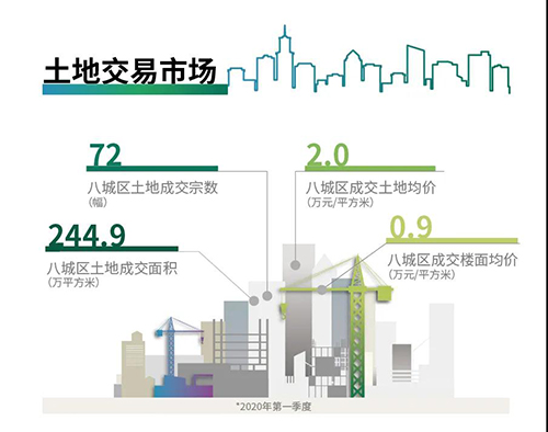 疫情爆發(fā)期間有多塊土地出讓遭到臨時(shí)中止,不少地塊延遲掛牌,在一定程度上延緩了市場需求的釋放。伴隨著疫情逐步得到控制,和市場信心的持續(xù)復(fù)蘇,從市場建設(shè)用地成交面積與成交溢價(jià)率兩方面均可看到一月到三月的市場熱度變化。一月八城區(qū)土地成交面積環(huán)比下降23.1%,二月持續(xù)環(huán)比下降49.8%,直到三月呈現(xiàn)觸底回升跡象,環(huán)比上漲36%;在溢價(jià)率方面亦可看到類似趨勢,土拍市場平均溢價(jià)率在一月環(huán)比下跌11.5%,二月環(huán)比下降4.7%之后,在三月出現(xiàn)回暖跡象,環(huán)比微漲4.2%。