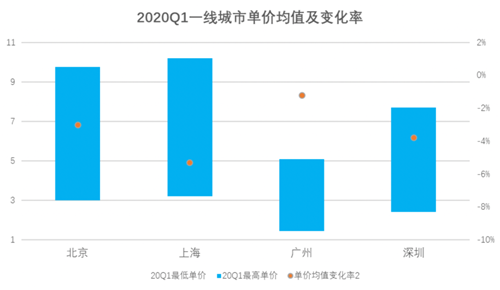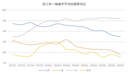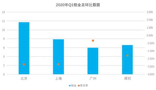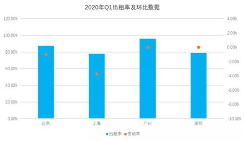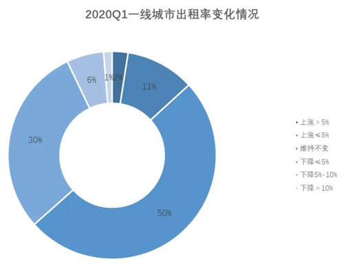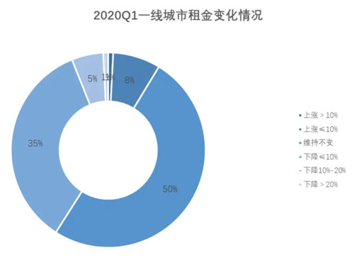 2020年一季度一線城市平均租金降幅超前5個季度的租金平均降幅2.1%,達到2.5%;出租率下跌1.2%,不但高于前5個季度的出租率平均跌幅0.7%,更是創(chuàng)2019年一季度以來的最大降幅。