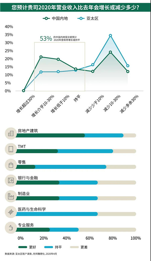 這一結(jié)果與當(dāng)前大多數(shù)在華租戶已經(jīng)復(fù)工且企業(yè)信心隨之逐步恢復(fù)相吻合——約53%的中國內(nèi)地受訪者預(yù)計(jì),2020年?duì)I收將增長或持平,其中房地產(chǎn)、科技和電信行業(yè)最為樂觀。但不容忽視,受疫情影響國內(nèi)整體經(jīng)濟(jì)環(huán)境仍充滿挑戰(zhàn),仍有約三分之一的受訪者預(yù)計(jì)營收將出現(xiàn)兩位數(shù)的下降。