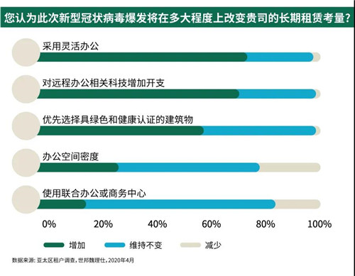 長遠(yuǎn)來看,此次疫情或?qū)⒋偈棺鈶艮k公習(xí)慣發(fā)生變革。約73%的受訪者表示將增加采用靈活辦公的方式。同時(shí),報(bào)告亦顯示,疫情還提高了租戶對(duì)辦公建筑綠色與健康認(rèn)證的意識(shí)。