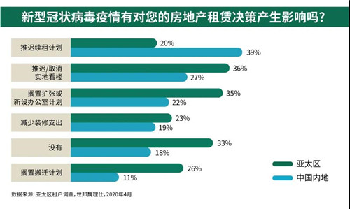 此外,疫情導(dǎo)致中國內(nèi)地租戶推遲續(xù)租計(jì)劃與實(shí)地看樓。但相較于亞太區(qū)的租戶,中國內(nèi)地租戶的新設(shè)/擴(kuò)張或搬遷計(jì)劃受影響程度較低。