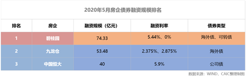 5 月份房企海外債發行重啟,打破 4 月零記錄。內地房企海外債經歷了 1 月發行井噴,爆發疫情的 2 月發行驟然收緊,以及國內疫情逐步控制后 3 月發行恢復,到 4 月海外疫情爆發,全球金融市場動蕩,海外債發行降至 0 , 5 月份以時代中國發行 2 年期 6% 的美元債結束國內 1 個多月海外債斷檔期,債市復蘇。5 月碧桂園發行了兩筆海外債居 CAIC 房企債券融資總額監測榜榜首,其中一筆 5.44 億美元規模的海外債發行利率僅為 5.4% ,較 2019 年發行成本有一定下降,同時也是自本年度 1 月初之后首次發行海外債。