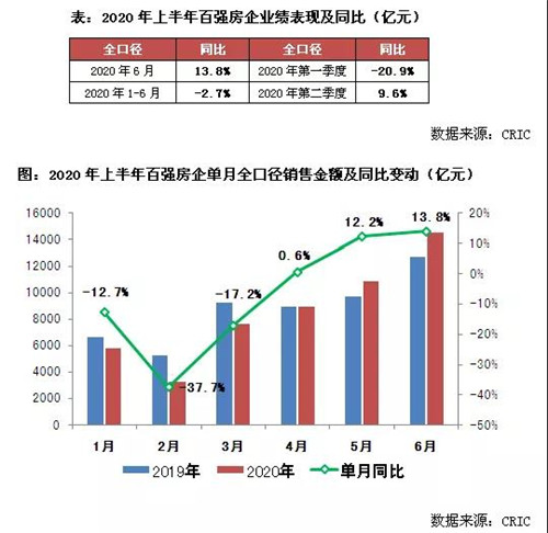 2020年6月,市場(chǎng)熱度持續(xù)、房企去化加速,TOP100房企單月實(shí)現(xiàn)全口徑銷(xiāo)售金額14517.2億元,環(huán)比增長(zhǎng)33%。單月業(yè)績(jī)同比逐月回升,自4月轉(zhuǎn)正后進(jìn)一步提升至13.8%。