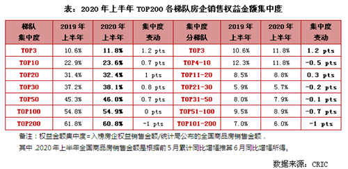 另一方面,從上半年的銷(xiāo)售集中度來(lái)看,TOP50房企集中度與去年同期相比基本持平,而TOP51-100房企和TOP100之后房企的集中度分別同比下降0.7和1個(gè)百分點(diǎn),權(quán)益金額集中度出現(xiàn)一定回落。