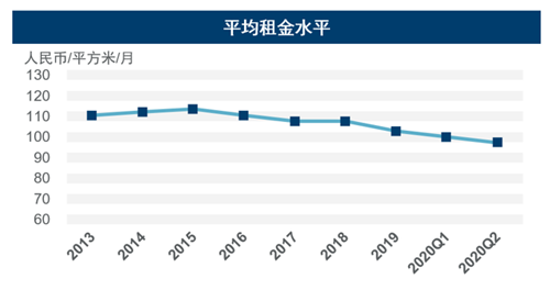 2020年第二季度,大連市甲級寫字樓市場無新增供應,總存量約92.2萬平方米。隨著市場競爭加劇,市場步入租戶市場模式,多個項目業主采取調整租金策略或以增加免租期、裝修期等優惠政策促進成交,致使平均租金環比下降2.8%至每月每平方米人民幣97.3元。