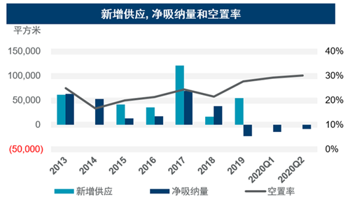 經歷上一季度的歇業狀態后,本季度,隨著疫情影響的逐步減弱,零售市場處于復蘇狀態,大部分購物中心項目除休閑娛樂和兒童教育外,其他行業均已全面復工。但疫情的影響仍導致中小商戶閉店數量明顯增加。至此,整體市場空置率環比上升2.3個百分點至13.2%。
