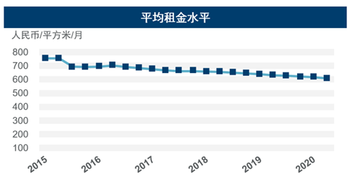 在市場無新增供應的情況下租金略有下降,首層平均租金報價環比下降至每月每平方米人民幣608元。