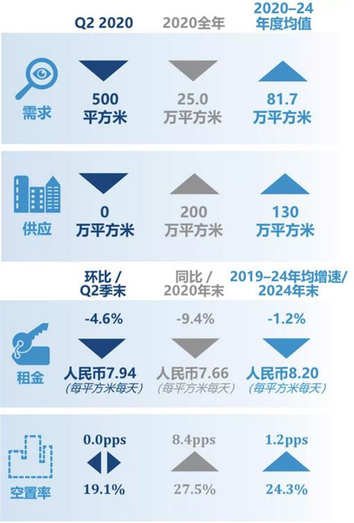高力國際預(yù)計下半年市場需求將逐步回彈,但年內(nèi)應(yīng)會保持低位。考慮到目前仍未結(jié)束的疫情與計劃入市的新項目,平均租金應(yīng)會在年內(nèi)持續(xù)下滑,盡管有部分的新項目可能會推遲至2021年入市。
