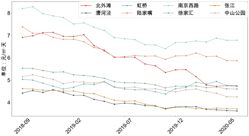 圖:2018年9月~2020年6月上海主要商圈甲乙級寫字樓租金走勢