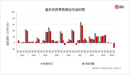 上半年受疫情影響,甲級辦公樓市場新增供應僅錄得重慶來福士寫字樓A座交付,新增面積6.4萬平方米。2020年全年重慶可供租賃的甲級辦公樓有限,銀行自用的總部樓宇居多,市場迎來去化機遇期,空置率有望大幅下降。而突如其來的疫情卻為市場蒙上一層陰影,市場不確定性增加。