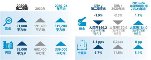 2020 年第二季度,盡管全市租金有著向下調整的壓力,琶洲的租金仍然逆市微升,環比增長 0.3% 達人民幣 149/ 平方米 / 月,體現出琶洲寫字樓市場仍然企穩。