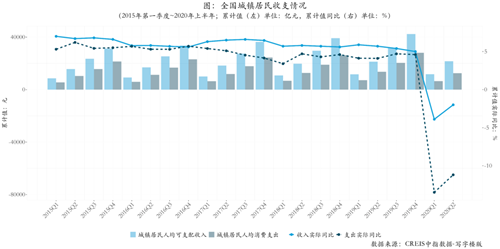 支出:2020上半年,全國(guó)居民人均消費(fèi)支出9718元,比上年同期名義下降5.9%,扣除價(jià)格因素,實(shí)際下降9.3%。其中,城鎮(zhèn)居民人均消費(fèi)支出12485元,下降8.0%,扣除價(jià)格因素,實(shí)際下降11.2%。