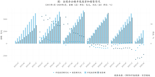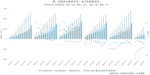 銷售額:2020年1~6月,全國(guó)辦公樓銷售額為1789億元,同比下降28%,降幅較1~5月收窄7.3個(gè)百分點(diǎn)。