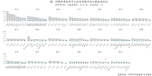 6月,20城市各商圈的甲乙級寫字樓平均日租金為3.00元/㎡·天,同環比分別為-4.79%和-0.12%。