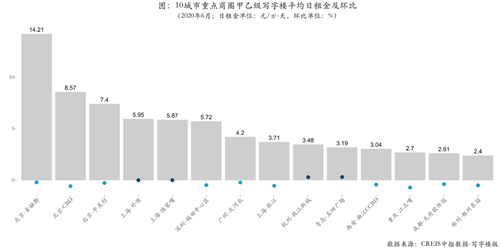6月,北京甲乙級寫字樓日租金位列20城最高,達7.19元/㎡·天,合肥最低,為1.76元/㎡·天,廈門、福州同比微漲。