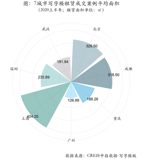 面積:上半年,上海成交寫字樓案例的平均面積最大,達到404.25㎡,其次為北京和成都,分別為326.50㎡和318.50㎡,武漢、重慶平均面積分別為191.94㎡和188.26㎡,最小的為廣州,為126.89㎡。