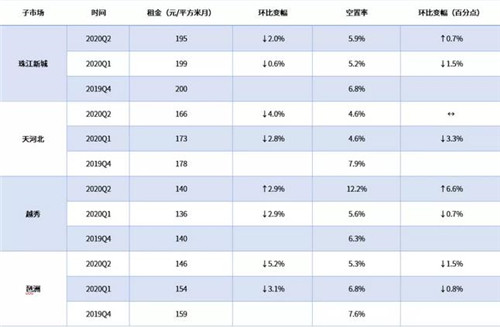 值得注意的是,第二季度,越秀子市場甲級寫字樓空置率在上升的同時,其租金水平也在升高,在幾個子市場中獨樹一幟。這是因為新入市的星寰國際商業中心的租金水平在越秀子市場中相對較高,把該子市場的租金水平拉高。此外,琶洲租金跌幅相對最大,與未來該片區有大量新增供應有關。