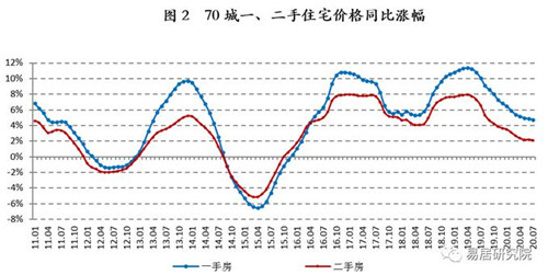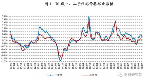 2020年7月,70城一、二手住宅價格同比漲幅分別為4.8%和2.1%,相比6月分別收窄0.12、0.09個百分點,預計未來幾個月一二手房價同比漲幅基本保持平穩。
