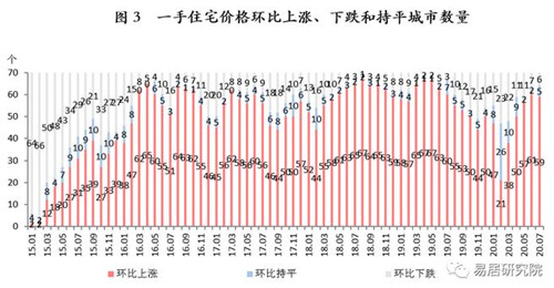 2020年7月,70個大中城市一、二手住宅價格環比漲幅分別為0.47%和0.26%,相比5月分別收窄0.11和0.05個百分點。目前70城新房價格已經連續63個月上漲。