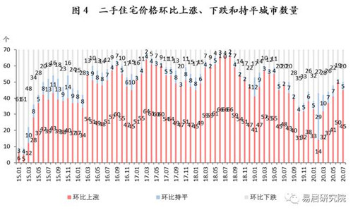 7月70個大中城市中,二手住宅價格上漲的城市有45個,持平的城市有5個,下跌的城市有20個。相比6月,7月房價上漲的城市數量減少5城,房價持平的城市數量增加4城,房價下跌的城市數量增加1城。