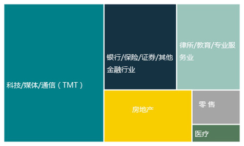 從行業分布來看,租賃和商務業、科技/媒體/通信(TMT)企業數量占比最多,占比分別為26.27%和22.19%,這兩大行業合計占比達48.45%,占各行業企業數量的比例近半,其次住宿和餐飲業占比也達19.94%。