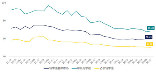 2020年7月重慶甲乙級寫字樓整體租金為58.45元/㎡·月,甲級和乙級寫字樓租金分別為68.48/㎡·月和50.31/㎡·月。隨著經濟的逐漸恢復,租金變化趨穩,整體租金水平與6月持平,甲乙級租金小幅波動,其中甲級微漲1.18%,乙級微跌0.16%。受大環境影響,同比跌幅較為顯著,整體租金水平同比下跌9.30%,甲乙級分別下跌12.70%和6.90%。