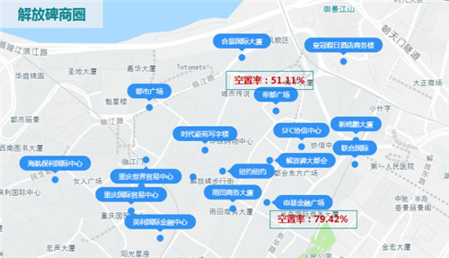 解放碑商圈作為重慶首個中央商務區,區域內甲乙級寫字樓扎堆。當前解放碑商圈空置率高達33.10%,各大寫字樓空置水平不一,但個別項目空置率較高,如申基金融廣場空置率達79.42%,有15層樓均為整層空置;另外帝都廣場AB塔空置率也超50%。