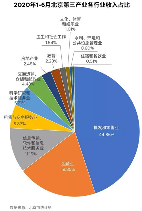 在今年上半年北京第三產業中,批發零售、金融、信息技術和租賃與商務服務業所占份額分居前四位,總收入占比分別為44.8%,19.85%, 11.15%級5.87%。批發零售類收入雖然占比高,但這類企業歷來對寫字樓面積的需求低,而剩下的三個行業則一直以來都是北京寫字樓需求的主力,此次雖然疫情來勢洶洶,但這三個行業在北京的表現依然穩定。