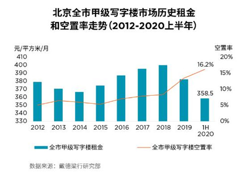為盡快提高入駐率和最大限度減少自身損失,寫字樓業主紛紛為租戶提供更優惠的租金和更大的免租力度,使2020年上半年北京全市寫字樓有效凈租金同比下降9.5%,達每月每平方米358.5元,創2012年以來新低。