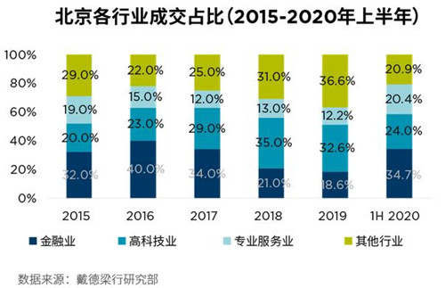 一直以來,金融業、高科技互聯網和專業服務業為北京寫字樓市場成交的三大主力行業,上半年三大主力行業成交面積之和占總成交面積的79.1%。未來,在北京服務業擴大開放、金融開放和發展新基建的政策鼓勵下,這傳統三大主力行業仍將繼續領跑北京寫字樓租賃市場。