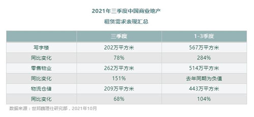 2021年三季度,盡管受到小規模疫情爆發和臺風汛期等因素的影響,中國商業地產租賃需求加速反彈。寫字樓、零售物業和倉儲物流的當季凈吸納量分別較去年同期大幅增長78%、151%和68%。更為重要的是,三大物業類型今年前三季度累計需求均已突破上一輪市場周期的同期高點。上一次市場出現相同的信號要追溯到2010-2011年,此后中國商業地產市場全面進入新一輪的增長周期。