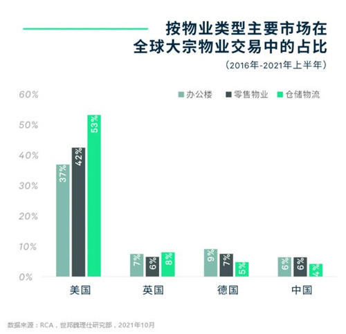 疫情爆發以來,國內產業地產投資迅猛發展,在大宗交易金額中的占比目前已經達到15%以上,但與全球平均約25%的比重相比仍有長足的增長潛力。從全球資本配置的角度我們也能得出相近的結論。根據RCA的數據統計,2016年至今中國的物流地產交易額僅占全球4%;該比例也低于中國辦公樓和零售物業在全球大宗交易額的占比。