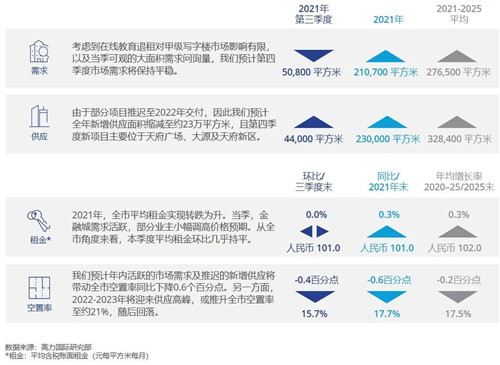 疫情后,金融城子市場需求持續活躍,而另一方面,該區域已面臨長達近兩年時間斷供,因此可租賃面積逐步減少。高力預計2022-2023年,隨著新項目交付入市,該局面將會得到緩解。