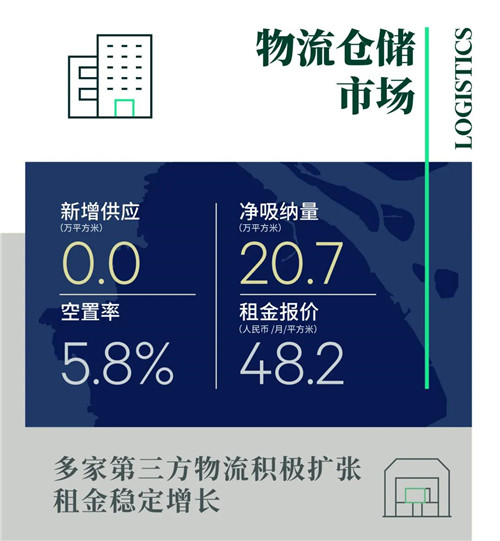 第三季度上海物流市場無新增供應(yīng)。第三方物流持續(xù)引領(lǐng)市場需求,松江、奉賢與金山分別錄得若干第三方物流公司的新租擴(kuò)租需求。隨著制造業(yè)與零售業(yè)高質(zhì)量發(fā)展,第三方物流也不斷打破地域限制,打造跨區(qū)域,多網(wǎng)點(diǎn)的縱深業(yè)務(wù)布局,成為倉儲物流強(qiáng)有力的支撐。同時隨著購物消費(fèi)節(jié)日的臨近,大型電商的需求增速回升,部分區(qū)域錄得短租成交。從區(qū)域來看,金山、奉賢季內(nèi)迎來大面積去化,季末全市空置率環(huán)比下降3.4個百分點(diǎn)至5.8%。在供不應(yīng)求且多個子市場長期保持滿租的狀態(tài)下,全市平均租金環(huán)比增長至每月每平方米48.2元。