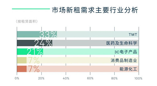 TMT (33%)、醫(yī)藥及生命科學(xué) (24%) 及3C電子產(chǎn)品 (21%) 為季內(nèi)租賃需求的主要來源。科技企業(yè)在商務(wù)園區(qū)各子板塊中多點(diǎn)開花,正值高速發(fā)展階段的游戲公司在漕河涇保持強(qiáng)勁擴(kuò)張態(tài)勢,電商運(yùn)營與直播類租戶分別選址臨空與金橋板塊,云計(jì)算與區(qū)塊鏈企業(yè)分別在張江和市北錄得大面積成交;醫(yī)藥研發(fā)租戶選擇在張江板塊內(nèi)實(shí)現(xiàn)升級搬遷,而具備性價比優(yōu)勢的浦江與外高橋板塊亦吸引部分相關(guān)企業(yè);電子產(chǎn)品租戶中,半導(dǎo)體與手機(jī)類企業(yè)在張江與金橋完成擴(kuò)租。此外,新能源汽車為主導(dǎo)的消費(fèi)品制造業(yè)以及各類能源化工企業(yè)亦錄得新租或搬遷成交。擴(kuò)張與新設(shè)仍為本季度主要成交類型,持續(xù)釋放的旺盛需求致各板塊空置率呈現(xiàn)不同程度的下降。租金方面,區(qū)別于上半年張江與漕河涇領(lǐng)漲全市租金的情況,三季度各子市場租金水平均實(shí)現(xiàn)正增長,推動全市平均租金報價與有效租金較上季分別上漲1.0%與1.3%。