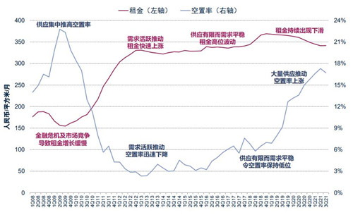 北京甲級寫字樓平均租金為每月每平方米人民幣341.7元,平均租金指數環比上升0.5%;全市空置率為16.7%,環比下降0.6個百分點,近 11 個季度以來首次實現"租金漲、空置跌"的走勢。就2021年前三季度而言,北京寫字樓市場需求持續釋放,但四季度新增供應量依舊巨大,未來一段時間全市寫字樓仍將面臨去化壓力。