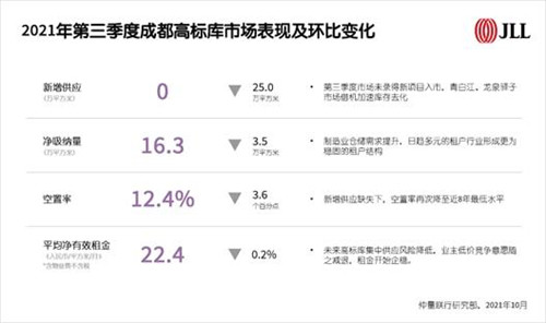 雖然自2020年下半年至2021年第三季度,青白江和龍泉驛子市場聚集了全市86%(56.7萬平方米)的新增供應,面臨短期集中供應壓力。但兩個子市場卻展示出良好的高標庫消納能力,憑借大批新入市且高性價比的優質可租賃倉庫,青白江和龍泉驛子市場成為了眾多快運、社區及生鮮電商、傳統電商等大面積倉儲需求租戶的擴租及新租首選。同期高標庫凈吸納量達到77.1萬平方米,帶動區域空置率持續回落。截至第三季度末,仲量聯行數據顯示,龍泉驛子市場空置率同比下降20.6個百分點至8.8%,為近8年最低水平。全市整體空置率也于第三季度降至12.4%,環比下降3.6個百分點,市場平均租金隨之企穩。