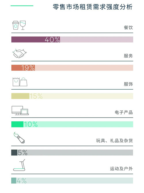 餐飲業依然表現搶眼,貢獻了約40%的租賃需求。包括哈根達斯和休閑餐飲gaga,持續增加在天河路商圈購物中心的布點。另外,服飾和電子產品零售商成交分別占比15%及10%,占據零售品類的前兩位。其中,電子產品零售商擴張增速更快,包括大疆和OPPO等均于季內開出新店鋪。此前拓展態勢積極的彩妝集合店,在二、三季度出現退租現象,但國際彩妝品牌仍然對天河路商圈格外青睞,DIOR彩妝香水旗艦店于本季在太古匯圍板擴租。